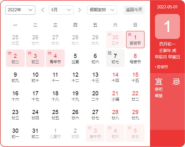 放假時間:2022年4月30日(周六)——2022年5月4(周三),共5天。
