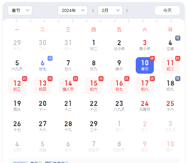 放假時間:2024年2月10日(周六)——2024年2月17日(周六),共八天。