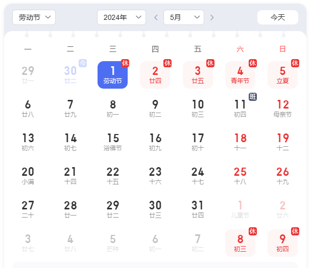 放假時間:2024年5月01日(周三)——2024年5月5(周日),共5天。